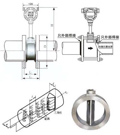流量計(jì)流通本體直徑與儀表的公稱(chēng)口徑基本相同。如圖一所示,流通本體內(nèi)插入有一個(gè)近似為等腰三角形的柱體,柱體的軸線(xiàn)與被測(cè)介質(zhì)流動(dòng)方向垂直,底面迎向流體,當(dāng)被測(cè)介質(zhì)流過(guò)柱體時(shí),在柱體兩側(cè)交替產(chǎn)生旋渦,旋渦不斷產(chǎn)生和分離,在柱體下游便形成了交錯(cuò)排列的兩列旋渦,即“渦街”。理論分析和實(shí)驗(yàn)已證明,旋渦分離的頻率與柱側(cè)介質(zhì)流速成正比。